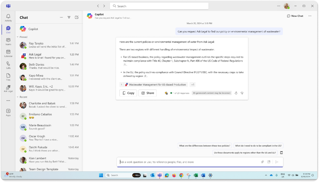 Consequently, LexisNexis is developing a Copilot for Microsoft 365 extension for Ask Legal, which expands Copilot's capabilities by bringing LexisNexis' leading functionality to users' fingertips. In the conversational experience with Copilot in Teams, corporate employees will be able to query the Ask Legal extension to get instant legal answers based on their company policy documents and stay up to date on legal requests and past records.