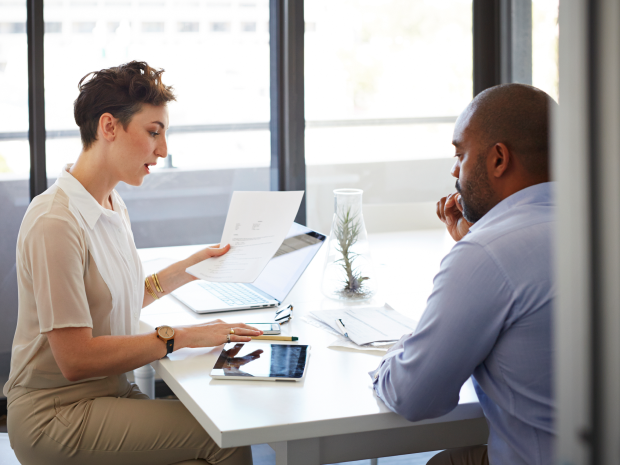 Two coworkers looking happily at a laptop screen in modern office.